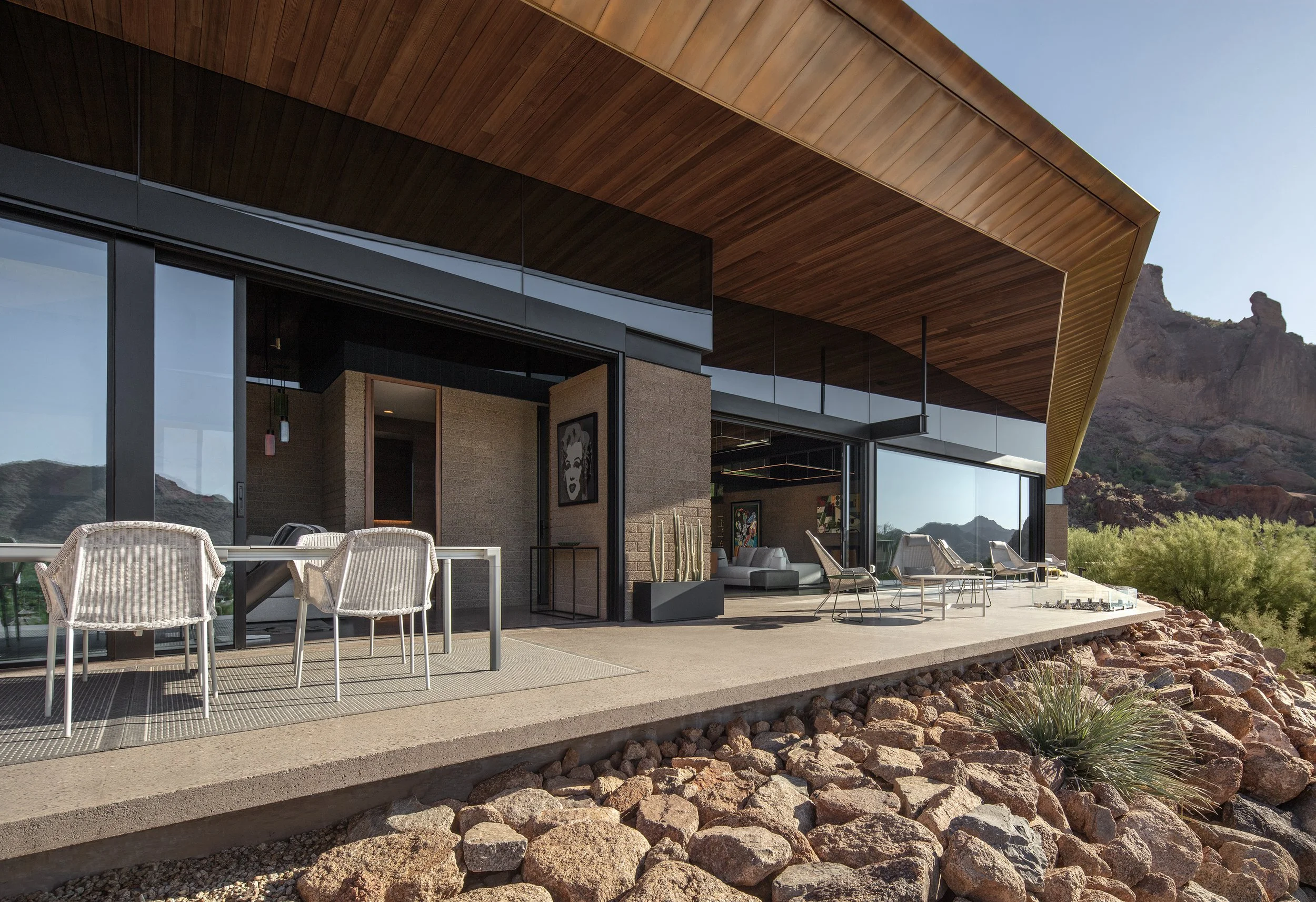 Located on Camelback Mountain, the iconic folded copper skin acts as a heat shield, shrouding a large open central space that visually and seamlessly allows the mountain landscape to pass through the center of the house, connecting the ground with the view. Flanking this pavilion-like canopy is a series of carved cave-like masonry rooms that provide respite and privacy. The simple form and rigorous material palette that echoes the mountain create a new form for a 21st-century desert dwelling. The architectural design of the house is a testament to innovation, harnessing natural light and shielding the interior from the harsh desert heat. The east (entry) and west (exit to yard) sides feature deep vertical slots, skillfully carved into the structure, to block the low morning and evening sun. The use of sustainable weathering materials, including copper, cedar, and CMU, not only reduces maintenance but also creates a natural palette that resonates with the mountain terrain, inspiring a new era of eco-friendly design.