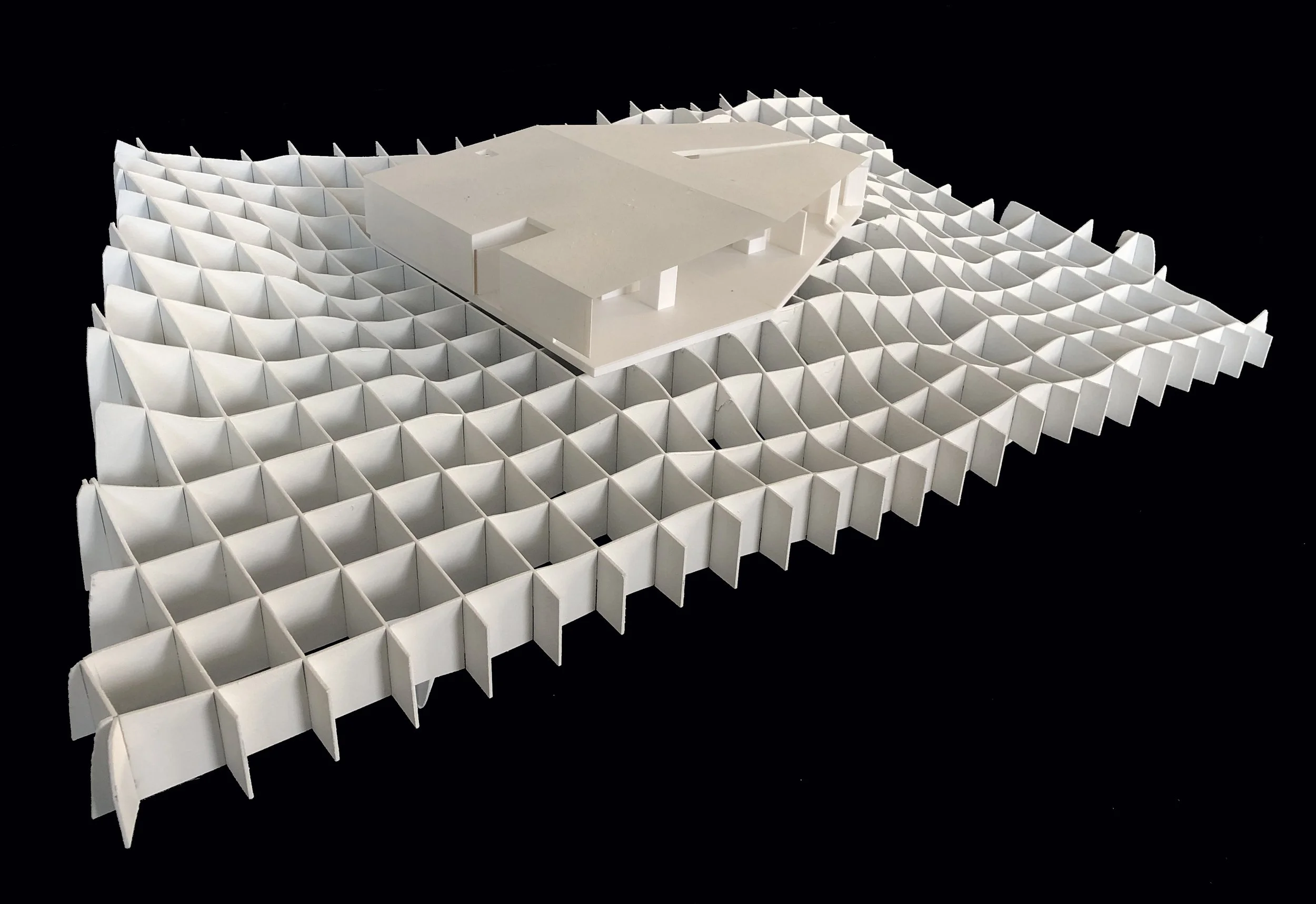 A thin copper tent surfing over a wave of boulders.